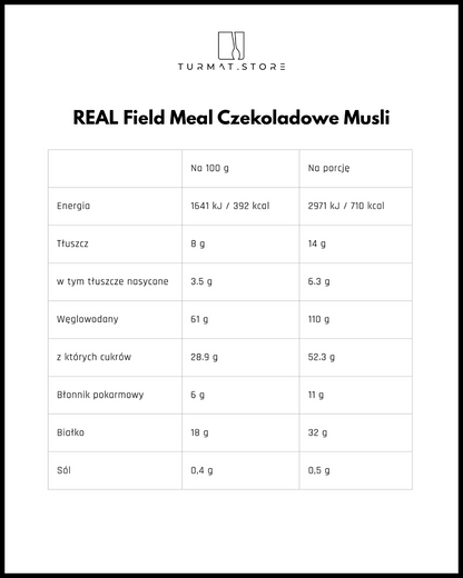 Real Field Meal Czekoladowe Musli to pyszna mieszanka, która zaspokoi Twoje pragnienie słodkości, jednocześnie dostarczając niezbędnej energii na cały dzień. Ta wyjątkowa kompozycja łączy w sobie smak czekolady i świeżych truskawek, tworząc idealny posiłek dla miłośników zdrowego stylu życia. Musli jest zapakowane w kompaktowe opakowanie, co czyni je doskonałym wyborem na każdą wyprawę, biwak czy długą wędrówkę. Daj się skusić smakowi czekolady i truskawek, a Twoje dni będą pełne energii i radości!