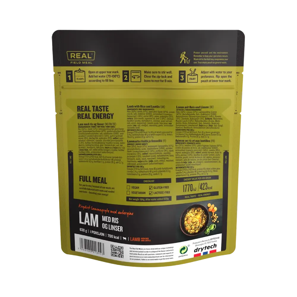 Real Field Meal z jagnięciną, ryżem i soczewicą to wyjątkowe danie, które przenosi smaki kuchni polowej na nowy poziom. Soczyste kawałki jagnięciny łączą się z delikatnym ryżem i pożywną soczewicą, tworząc harmonijną kompozycję smaków. To idealny posiłek dla tych, którzy pragną delektować się aromatycznym jedzeniem w otoczeniu natury. Wystarczy dodać wodę, wymieszać i odczekać chwilę, aby cieszyć się ciepłym, sycącym daniem, które dostarcza energii na dalsze przygody. Odkryj przyjemność płynącą z posiłku, który łączy prostotę z wyrafinowaniem!