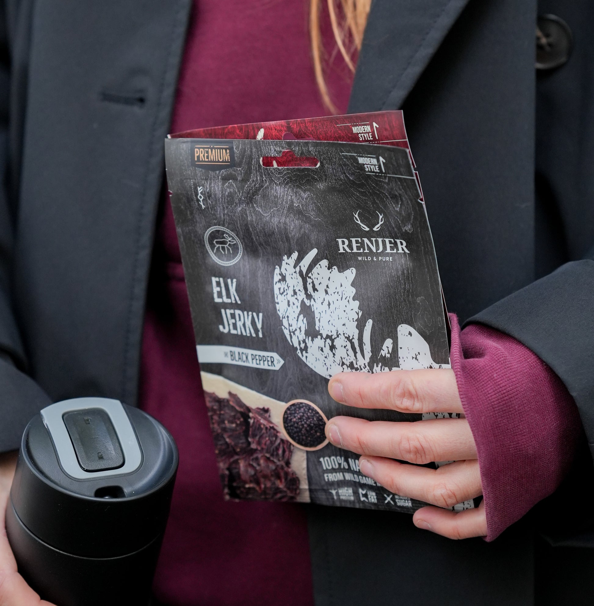 Enjoy the bold, wild flavor of RENJER's Elk Jerky Black Pepper. 100% wild European elk, seasoned with black pepper for a spicy, satisfying snack.