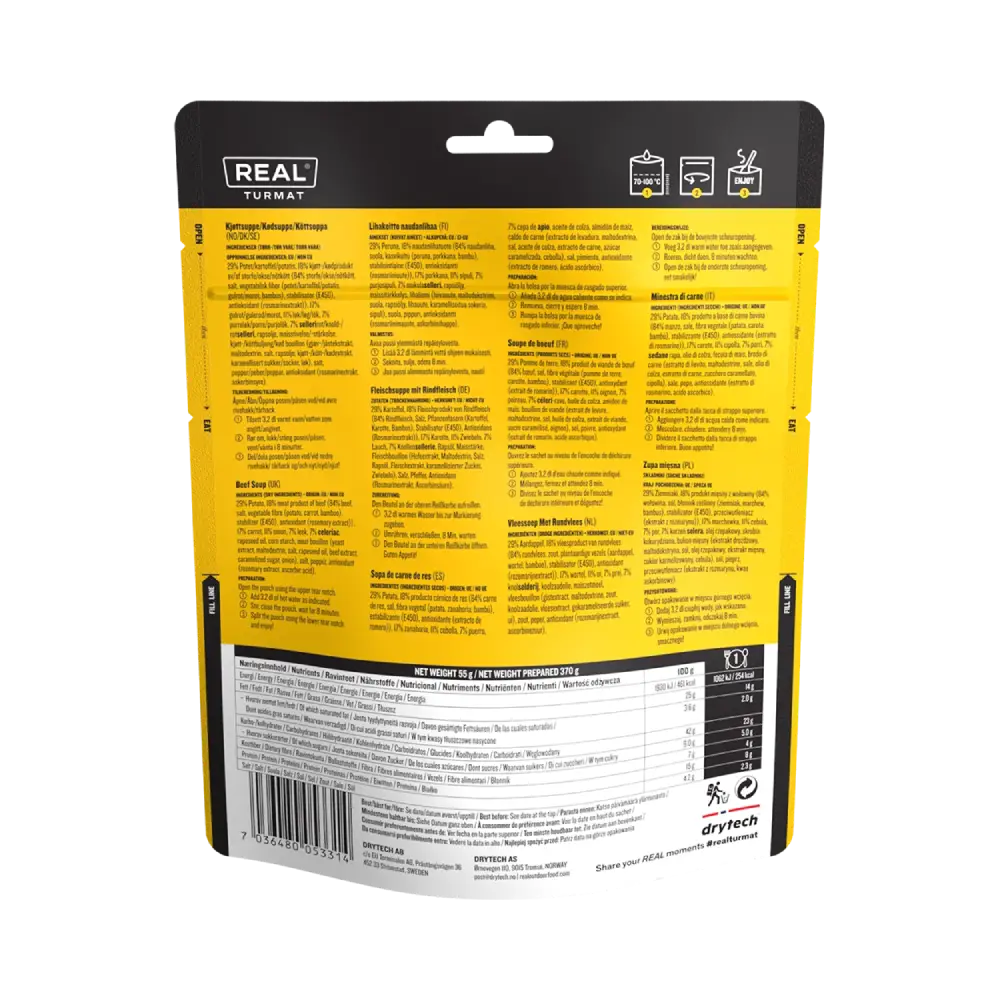 29% Potato, 18% meat product of beef (84% beef, salt, vegetable fibre (potato, carrot, bamboo), stabilizer (E450), antioxidant (rosemary extract)), 17% carrot, 11% onion, 7% leek, 7% celeriac, rapeseed oil, corn starch, meat bouillon (yeast extract, maltodextrin, salt, rapeseed oil, beef extract, caramelized sugar, onion), salt, pepper, antioxidant (rosemary extract, ascorbic acid).