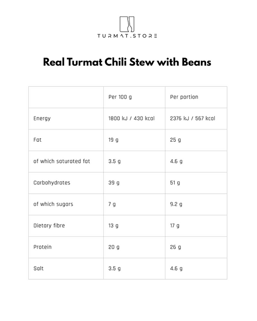 Real Turmat Chili Stew with Beans is a perfectly seasoned dish that captivates with its intensity of flavors and aromas. Hearty and full of character, it provides a vegan alternative to traditional 'Chili con Carne', offering unforgettable culinary experiences. Each serving of this delicious goulash provides energy and satisfaction, making it ideal for a warming meal after a day full of activities. Enjoy the exceptional taste and healthy approach to plant-based cooking!