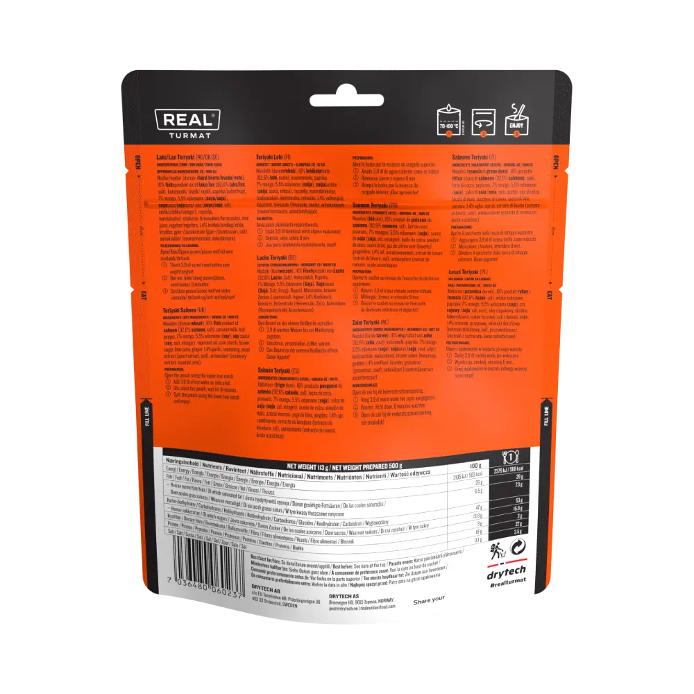 Noodles (durum wheat), 16% fish product of salmon (92.6% salmon, salt), coconut milk, bell pepper, 7% mango, 5,5% edamame (soy), soy sauce (soy, salt, vinegar), rapeseed oil, corn starch, brown sugar, lime juice, ginger, 1,4% garlic, seasoning, yeast extract (yeast extract, salt), antioxidant (rosemary extract, ascorbic acid).